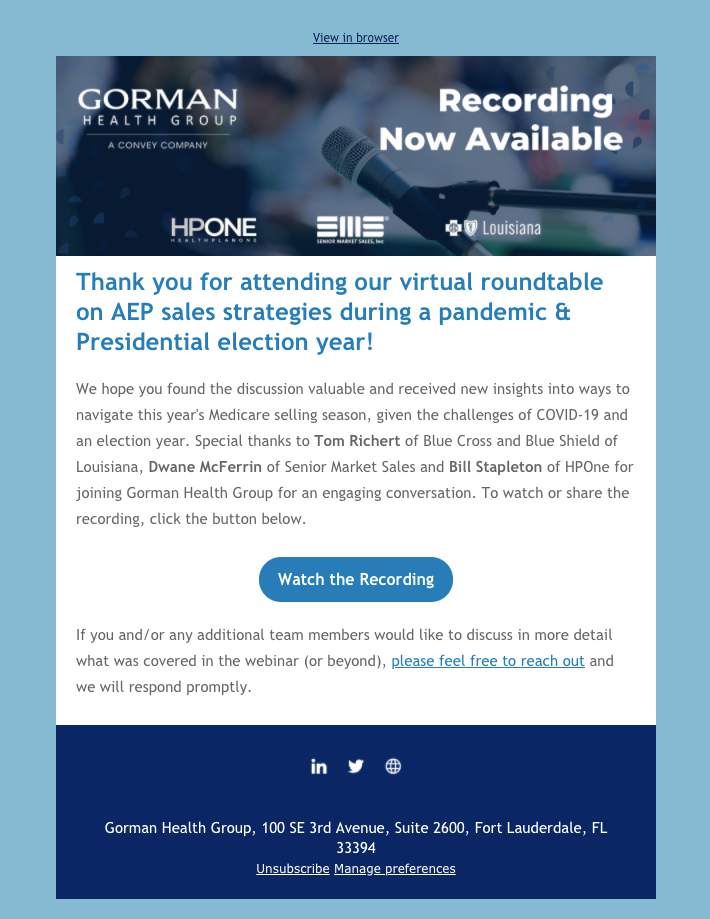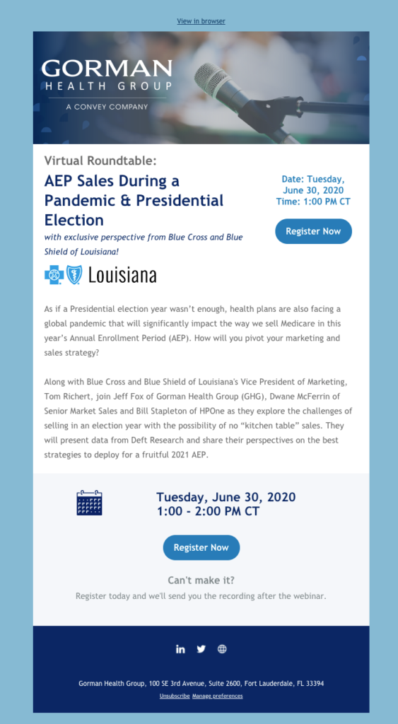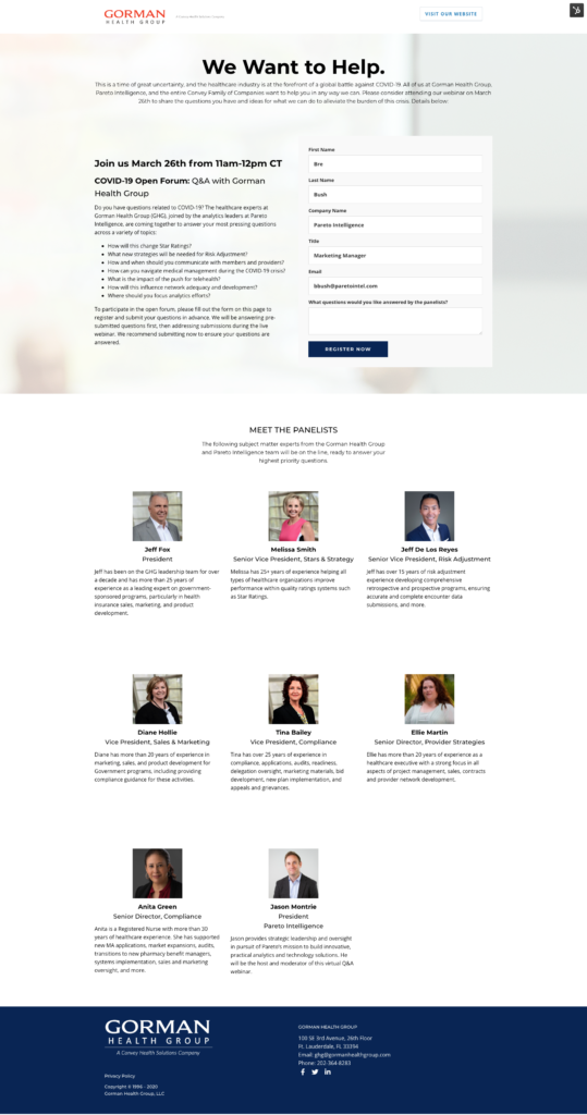 To become established thought leaders and stay top of mind with clients and prospects, Gorman Health Group (GHG) hosted webinars at a regular cadence in 2020 that consistently brought in over 400 registrants, thanks to our thoughtful and compelling marketing before and after each event. While GHG had been hosting webinars for years prior to the transition to our team, we significantly improved the process, evolved the look and feel, and added an on-demand webinar experience to extend the life of our content. We also used GHG’s reputation to help boost Pareto’s brand wherever it made sense. More details are below.